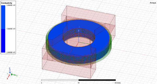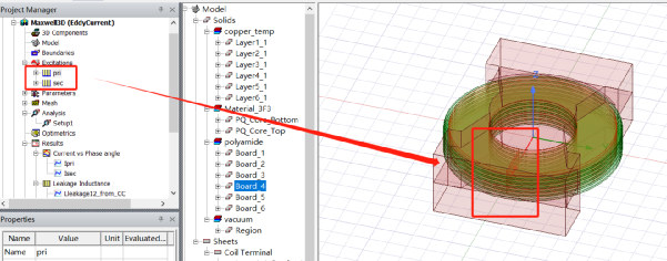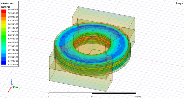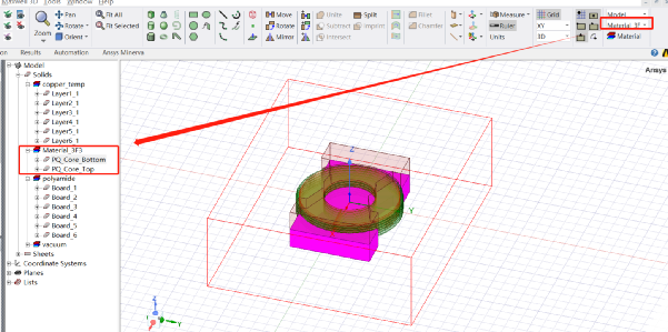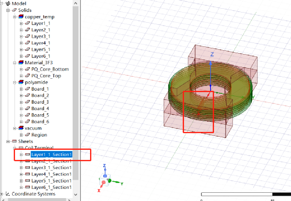 所用计算开关变压器模型如下图所示,PQ型铁芯,环型绕组和绝缘层组成;其中铁芯尺寸长宽14mm*7mm,工作频率为0.1MHz,通过Maxwell计算得到变压器变比、电感 、损耗等参数、电场、磁场分布图。最终仿真模型如下图所示。