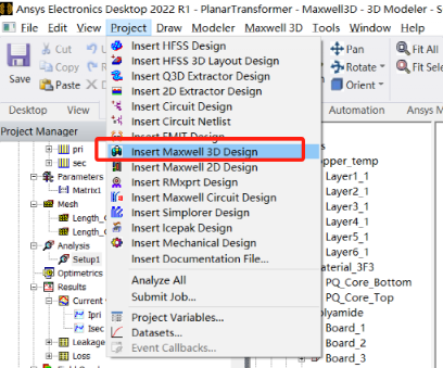 2.在主菜单Project下选择Insert Maxwell 3D Design,插入新Maxwell设计模块。