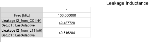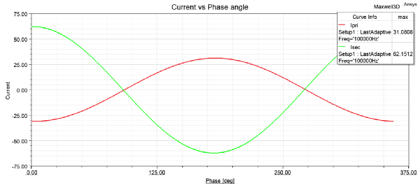 通过Maxwell计算开关变压器的工作频率0.1MHz下的电流比值1:2,电感、损耗等结果也验证此变压器结构和绕组参数满足设计要求。
