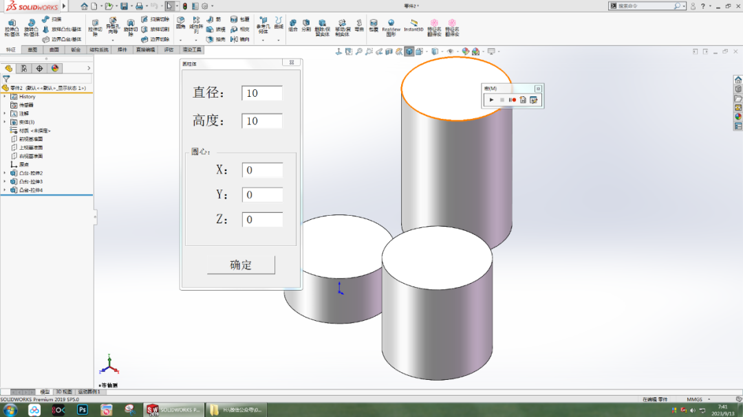 自建宏程序 绘图视频 建模步骤 1.【编辑宏】用的还是昨天录制的宏文件,录制过程相同。 2.【用户窗体】Caption:圆柱体;窗体高度:450;宽度:240 。 3.添加一个标签, Caption:直径;Font:修改字体和大小;TextAlign:左、右对齐、居中 。 4.添加文本框,Value:设置初始值10 。 5.添加框架和命令按钮,修改:Caption 。 6.按住Ctrl键拖动复制4